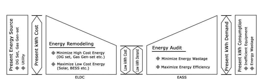 Our energy optimization methodology is illustrated in the diagram, which highlights two crucial processes: Energy Remodeling at energy source end and Energy Audit at energy consumption end. This is 180 degree approach from both end to achieve optimum cost benefit of an enterprise for it’s energy requirements. These processes help reduce energy costs and improve efficiency.